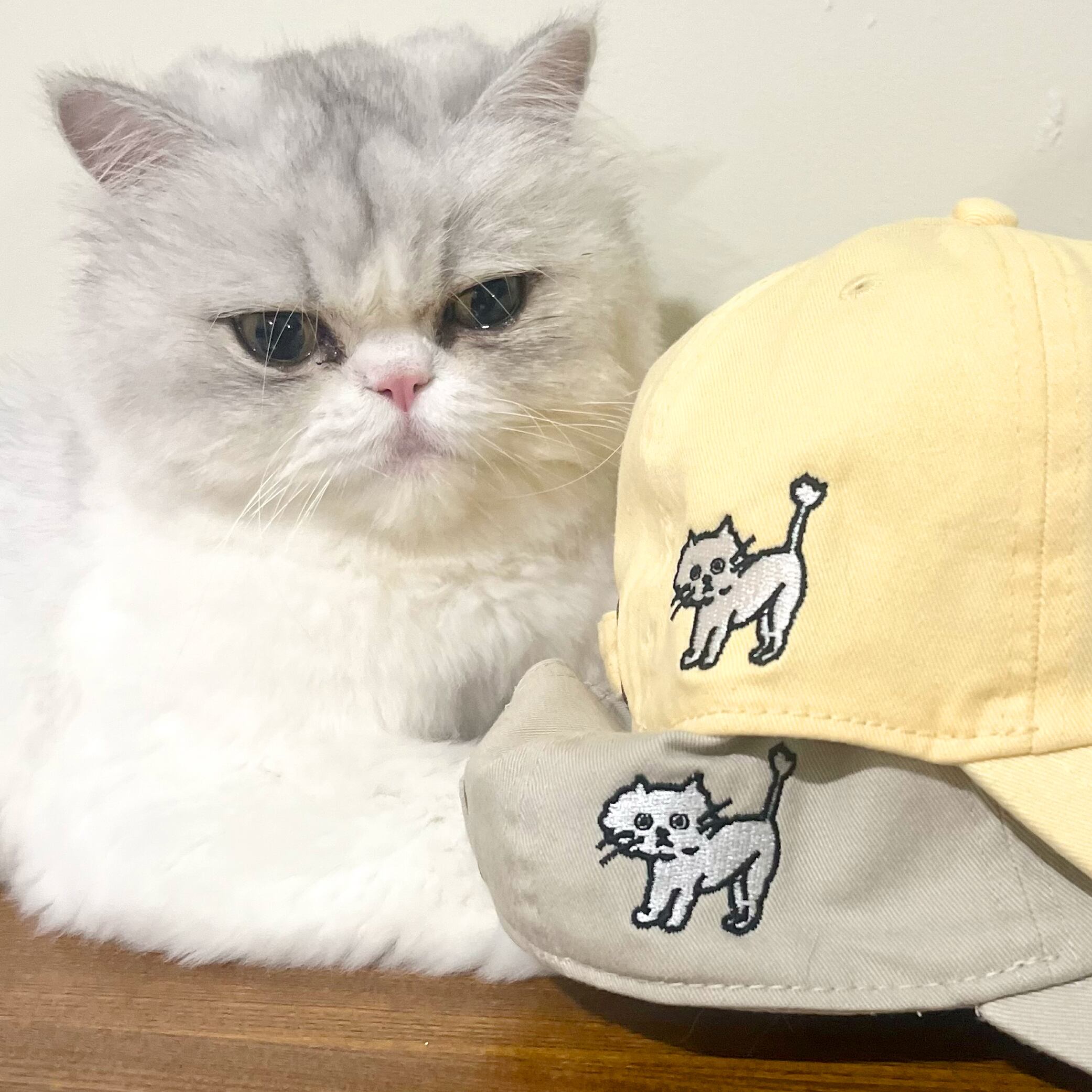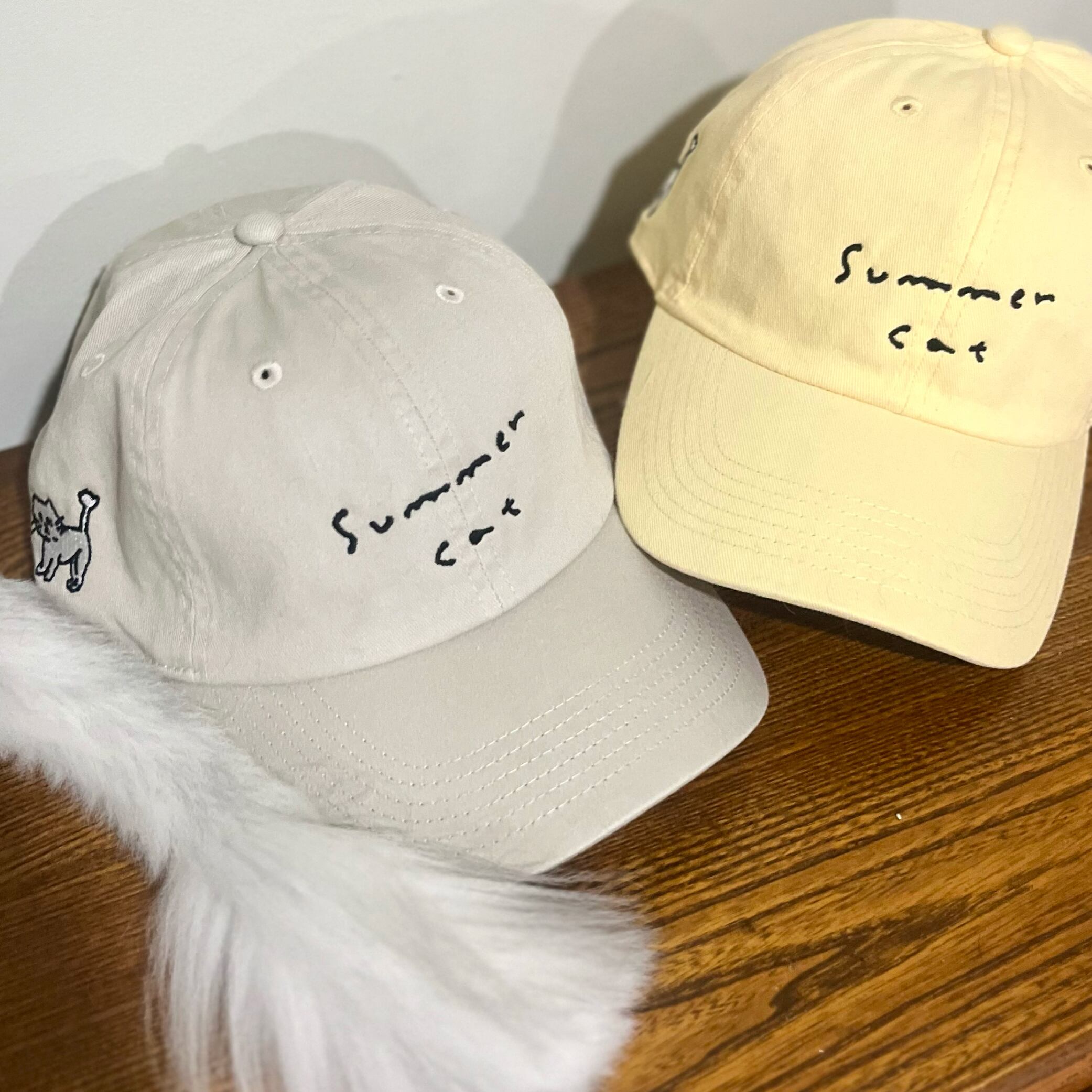 センターのゆるいSummer Catとサイドにサマーカットしたネコのイラストを刺繍しました。